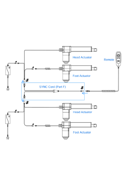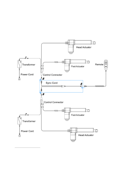 You can use the same remote to control two side-by-side bed bases by connecting the two transformer adapters with the SYNC CORD (see Figures 3 and 5).