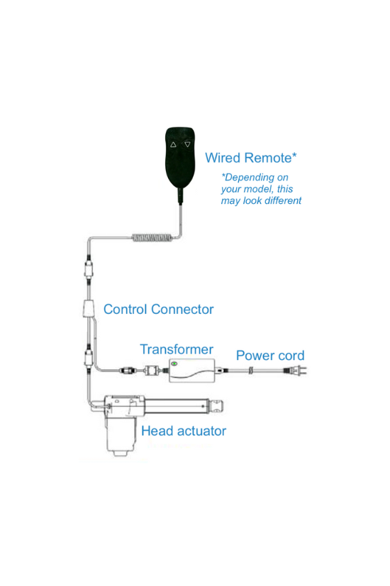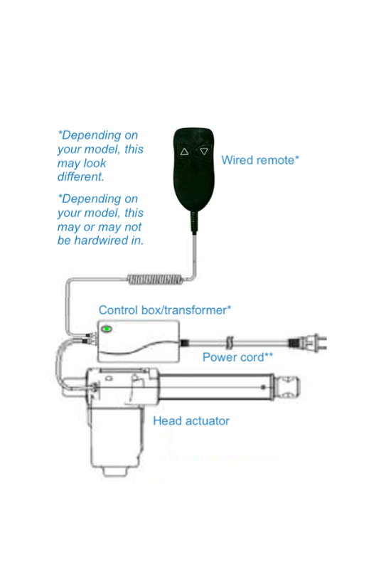 This converts power to the wired remote and head actuator and should have a green light indicating the base is getting power.
