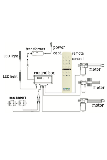 This is the “brain of the bed” and has a blue “sync” button on the cord. The massage motors, actuators, and under bed light plug directly in here.